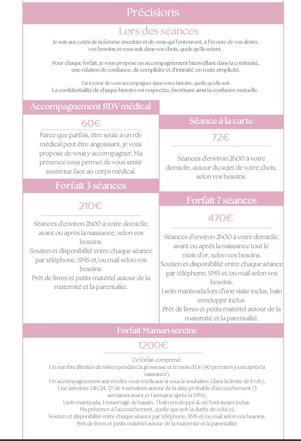 Selon vos souhaits, je peux vous accompagner en continu durant toute la période périnatale (c'est à dire avant, pendant et après l'accouchement), ou ponctuellement pour une durée spécifique, et même sur le parcours PMA.